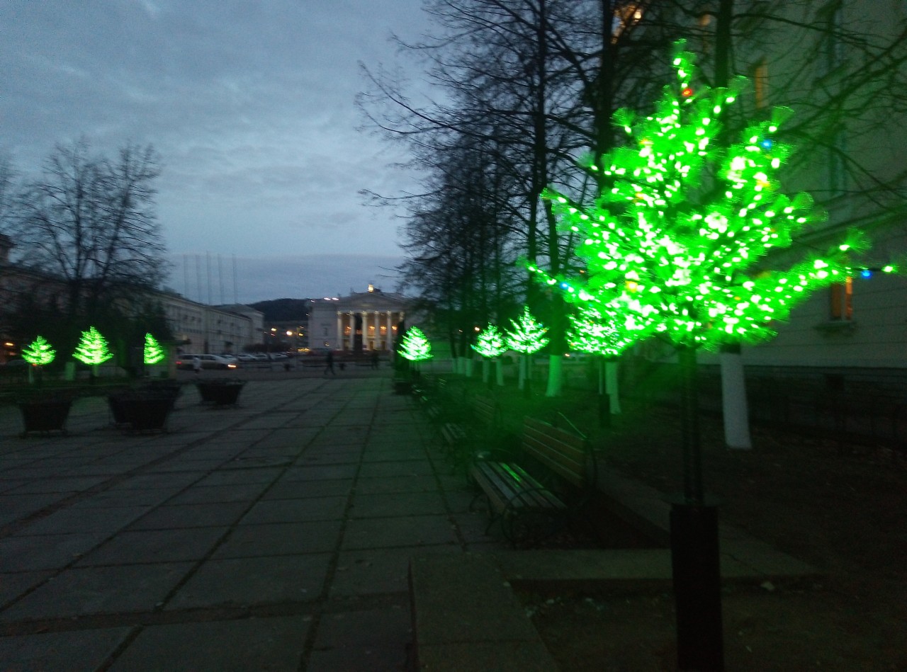 Четырнадцать светодиодных елочек вернулись на привычные места и уже работают. Они загораются и отключаются вместе с уличным освещением.