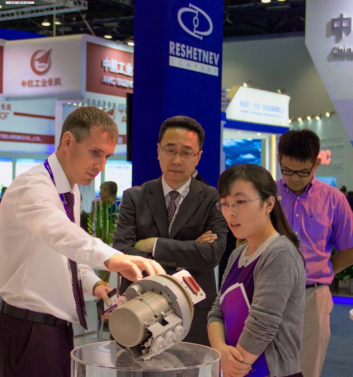 В Пекине решетневцы продемонстрировали как статические, так и динамические полноразмерные образцы новейших технических решений. Вниманию посетителей были представлены также и масштабные макеты космических аппаратов системы «Луч», «Глонасс-К» и «Гонец-М».