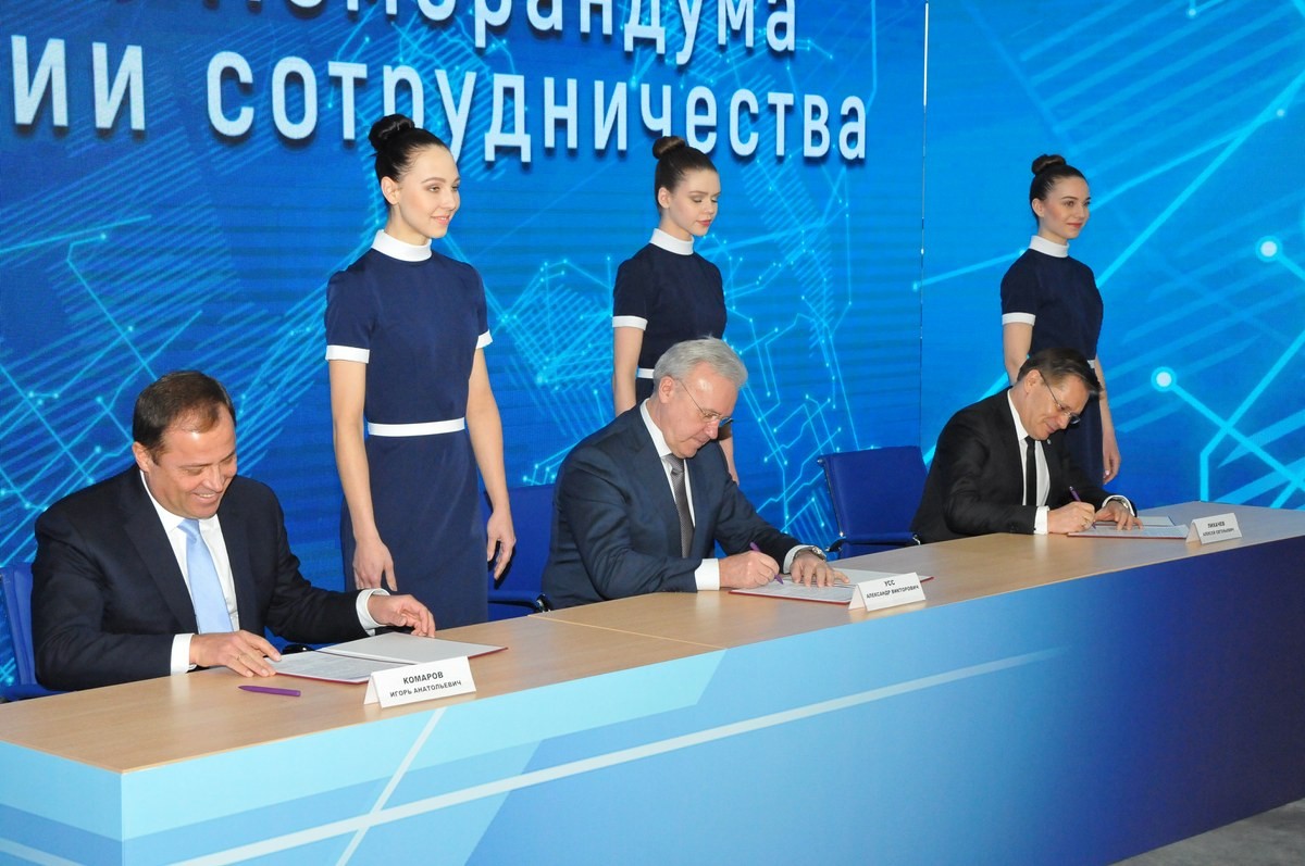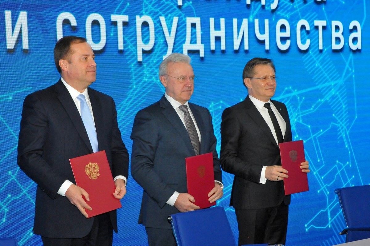 В промпарке состоялось подписание трехстороннего меморандума о взаимодействии. Документ, формирующий базу для развития ТОСЭР и направленный на развитие высоких технологий атомной и космических отраслей, подписали врио губернатора края Александр Усс, глава Росатома Алексей Лихачев и глава Роскосмоса Игорь Комаров.