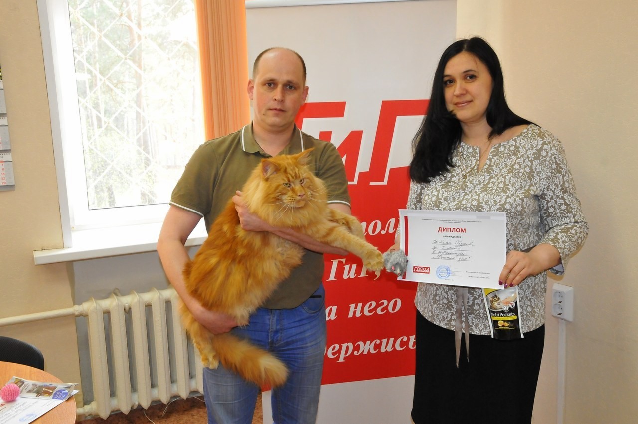 Напомним, первое место в группе «Одноклассники» завоевал шикарный красавец мейн-кун по имени Потифар Крем Мурленович. Фарик (так зовут его дома) пришел за призом с хозяйкой Натальей Глуховой и главой семейства Павлом.