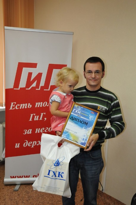 Виталий прибыл в Железногорск из Северска, ему очень нравится город, знакомится с его историей все больше и больше. Чтобы сделать 12 селфи, потратил все выходные. А в помощницы взял дочку Анечку – с ней и пришел на награждение. А что, все верно – победу-то вдвоем ковали! Папе фотоаппарат, дочке – рюкзачок от него.