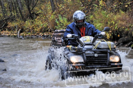 И вот мы опять несемся по тайге, зачем-то полезли на сопку. После пяти минут вертикального подъема я готова верить даже в то, что квадроцикл летает. Потом мы перепрыгнули канаву, спустились к речушке и помчались прямо по воде против течения. Андрей Вадимович, управляя квадроциклом, успевает проводить экскурсию, он настолько влюблен в тайгу, что готов подъезжать к каждому дереву, к грибам и птичкам, чтобы показать, насколько они прекрасны. В таком настроении мы влетаем в болото и начинаем тонуть в грязи.