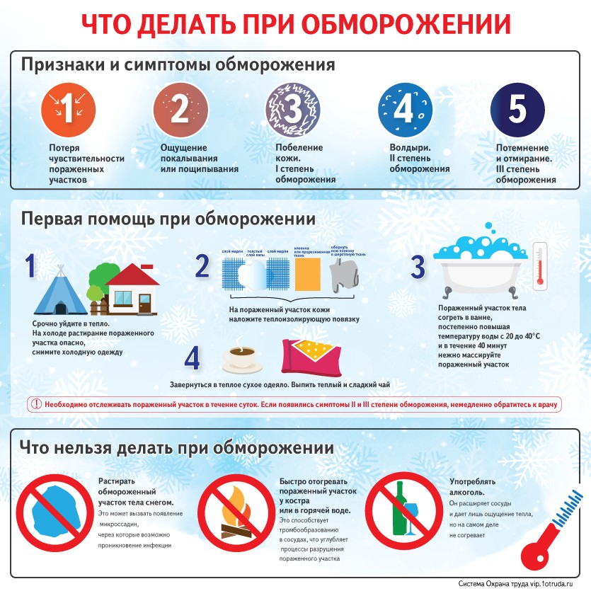 Если вы замерзли и не чувствуете, например, пальцев рук или ног, первое, что нужно сделать — согреться. Ни в коем случае не растирать онемевшие участки снегом или шерстяной тканью. Горячей водой поливать тоже нельзя. А вот размещение пострадавшего в хорошо обогреваемом помещении или автомобиле и теплое питье будут в самый раз. Если согрелись, но сохраняется потеря чувствительности на отдельных участках тела, ваша кожа поменяла цвет на белый или на темный, что еще хуже, нужно как можно быстрее обратиться к медикам, советует Михаил Ступницкий.