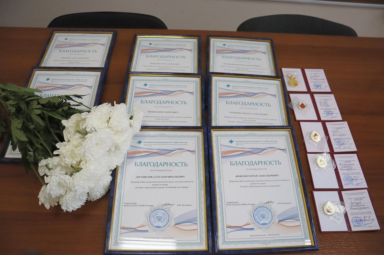Впервые в Клинической больнице № 51 вручили благодарности пяти династиям доноров в рамках Всероссийской акции «Семейный код донора», приуроченный к Году семьи в России. Рекордсменами железногорского отделения переливания крови являются семьи Голенковых (сдали 49 литров), Достоваловых (73), Фефеловых и Черновых (123). Андрей Путилов один сдал 39 литров крови.