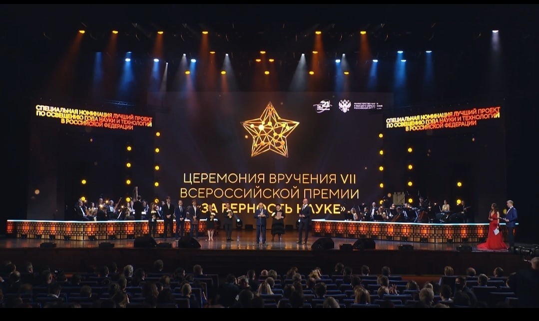 28 ноября на сцене Государственного Кремлевского дворца состоялась церемония награждения лауреатов VII Всероссийской премии «За верность науке». Третье место в специальной номинации «Лучший проект по освещению Года науки и технологий в Российской Федерации» завоевала Школа космонавтики из Железногорска, представившая онлайн-проект «Хочу всё знать!».