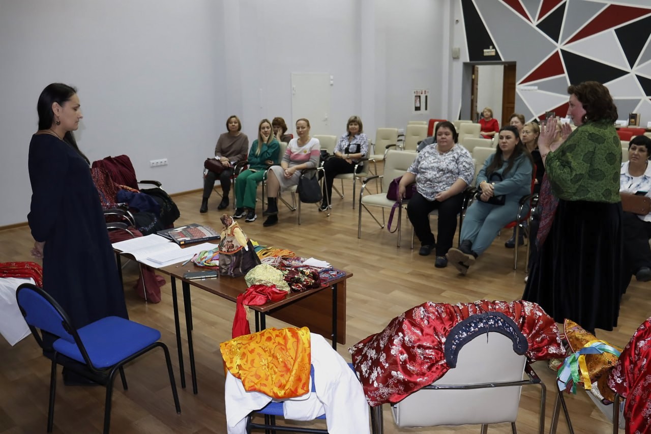Сегодня, 14 ноября, в Центральной библиотеке им. М. Горького прошел семинар для сотрудников детских садов по традиционному сибирскому женскому костюму. Его инициатором стала старший воспитатель д/с № 27 «Теремок» Нина Лебедева – руководитель городского методического объединения воспитателей №2 и красноярского кампуса Университета детства.