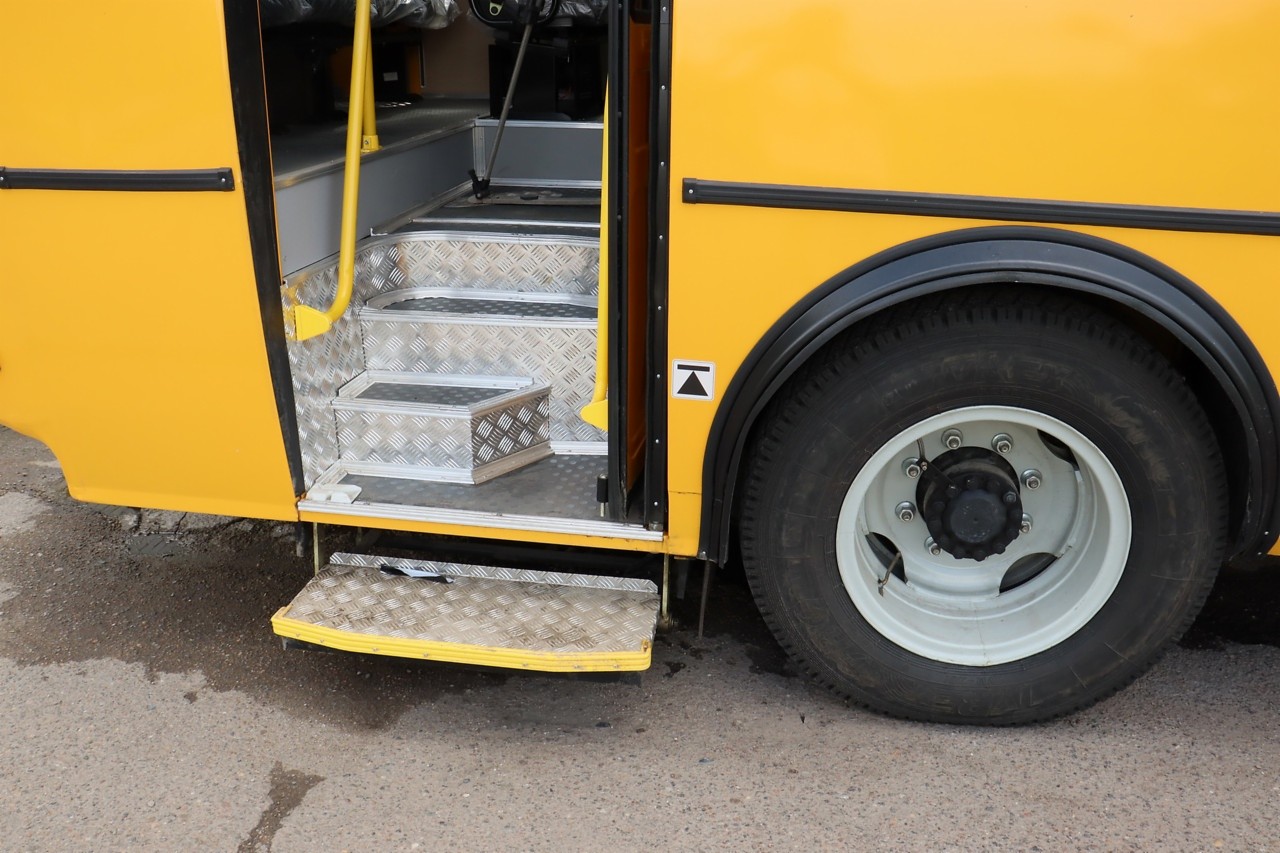Зимой не замерзнешь — есть три отопителя, утепленные пол, двери и люки. У автобуса дизельный двигатель с предпусковым жидкостным подогревателем, ограничитель скорости 60 км в час, предупреждающий сигнал заднего хода и блокировка движения при открытых дверях.