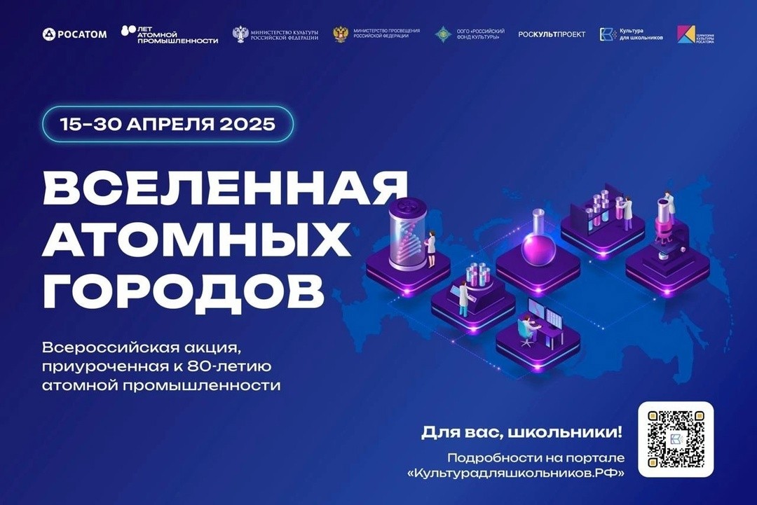 С 15 по 30 апреля в рамках Межведомственного культурно-образовательного проекта «Культура для школьников» при содействии программы «Территория культуры Росатома» пройдет всероссийская акция «Вселенная атомных городов», посвященная 80-летию атомной промышленности в России.