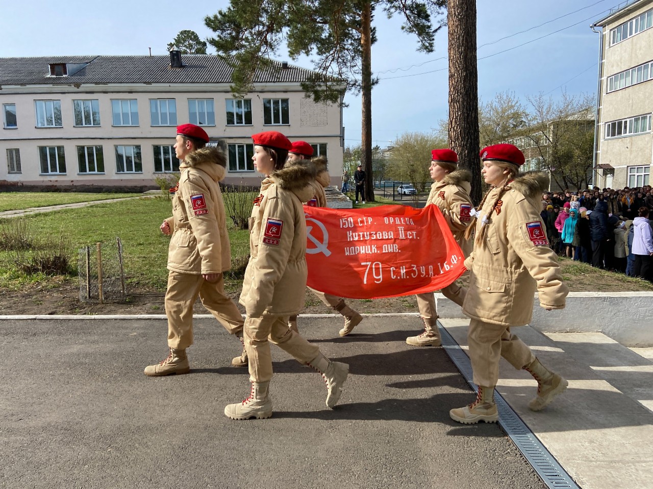 Сегодня в нашей школе прошла торжественная линейка, посвященная Дням Памяти о Великой Отечественной войне. Под звуки торжественного марша знаменная группа юнармейского отряда «Русь» водрузила копию Знамени Победы – символа мужества, героизма и несгибаемой воли советского народа.
