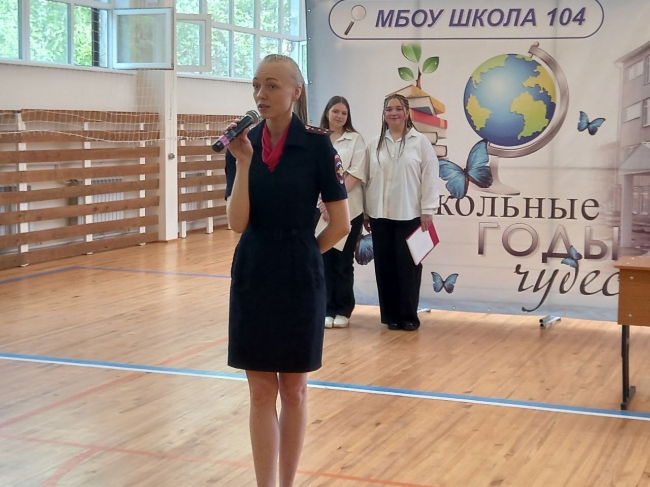 В школе №104 п. Подгорный состоялась линейка среди старших классов, на которой инспектор ПДН МУ МВД России по ЗАТО г.Железногорск Ирина Анохина провела важный инструктаж по технике безопасности в летний период.
