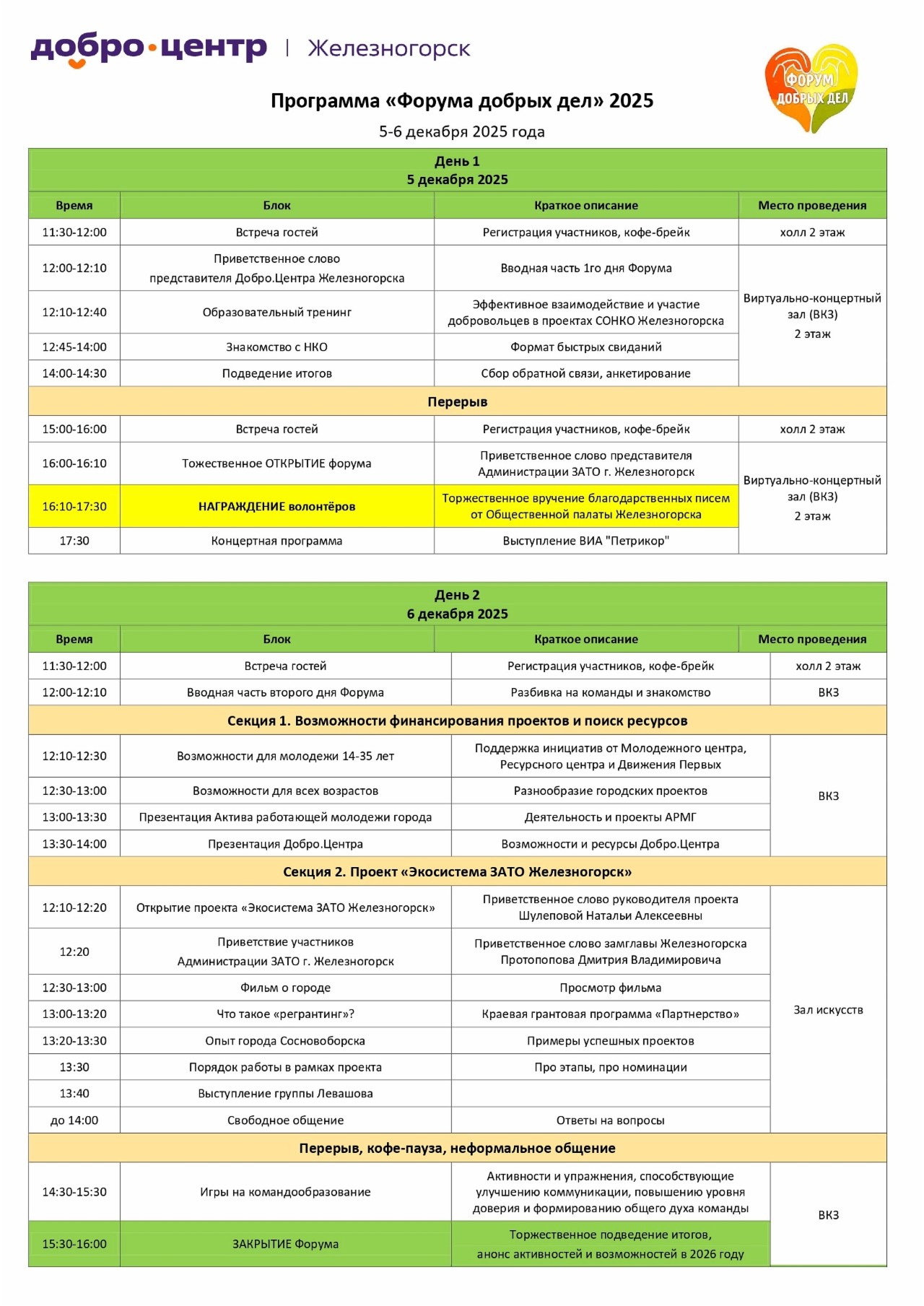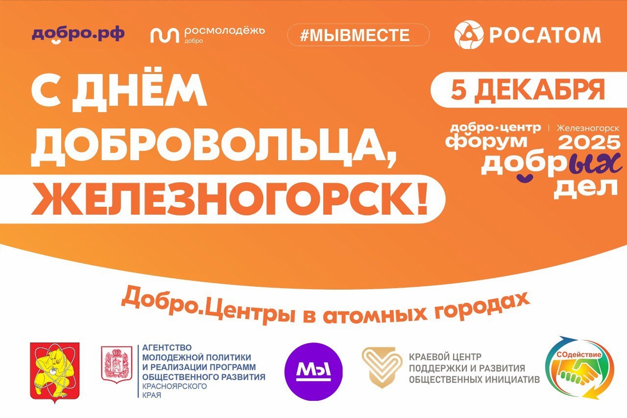 В Железногорске в день добровольца пройдет Форум добрых дел, организованный Добро Центром "Молния". Это образовательный тренинг по эффективному взаимодействию и участию добровольцев в проектах СОНКО Железногорска.