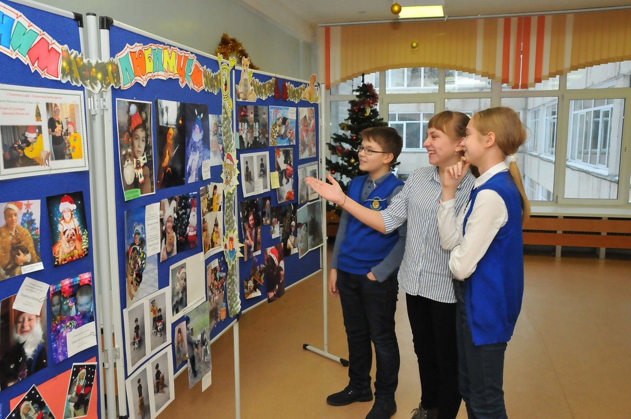 Помимо этого в холле второго этажа работает выставка фотографий – селфи с домашним питомцем. Кстати, кроме кошек и собак ученики и их учителя сфотографировались с символом наступающего года – поросенком.