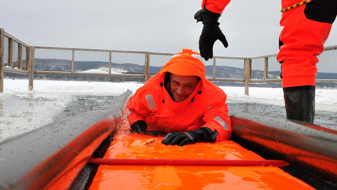 - Обвязавшись веревкой, один из спасателей с помощью десятиметрового надувного плота подполз к другому - изображавшему тонущего. И «пострадавшего» быстро удалось вытащить на крепкий лед.