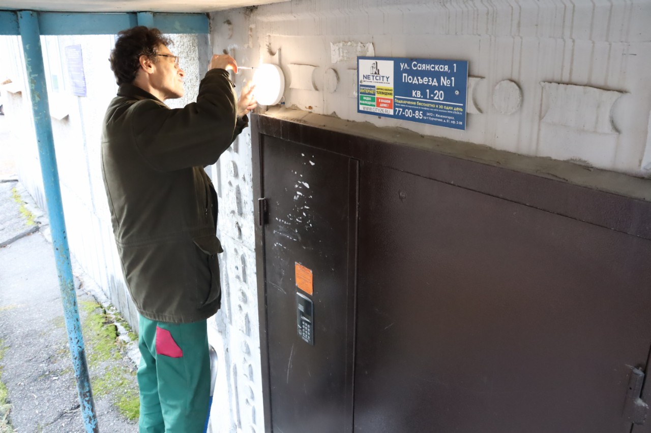 Сегодня специалисты УК "Горэлектросеть" поставили дополнительное освещение на входных группах дома по Саянской, 1.