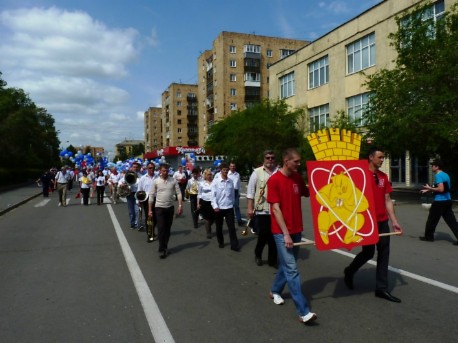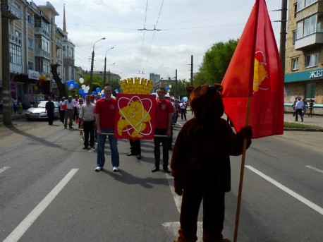 Сопровождал железногорцев оркестр Сибирской пожарно-спасательной академии. Представители власти прошли в колонне с символикой города, градообразующие предприятия – с шаровыми композициями в виде спутника и атома.