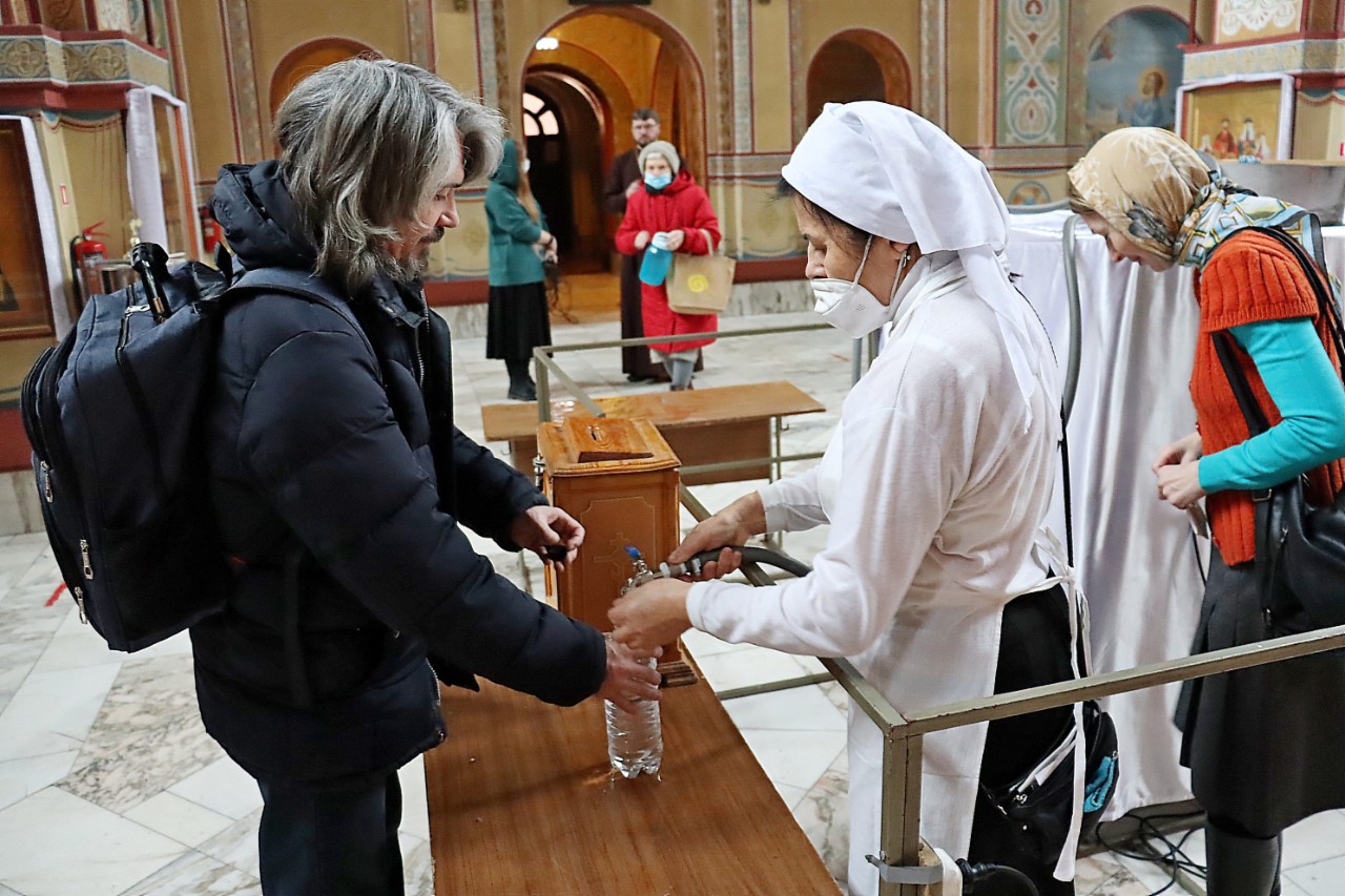 В соборе Михаила Архангела проходит раздача освященной воды. Сегодня ее будут раздавать до 19:30. В среду и четверг взять воду можно будет после богослужения примерно с 8 часов утра до 22:00.