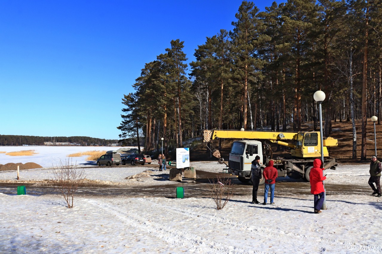 На берегу озера в районе моста по ул. 60 лет ВЛКСМ работает тяжелая техника – возит песок, щебень и другие инертные материалы. Здесь стартовали работы по благоустройству территории – строительству линейного «Нейтрино-парка». Глава ЗАТО Железногорск Игорь Куксин сегодня проверил ход работ.