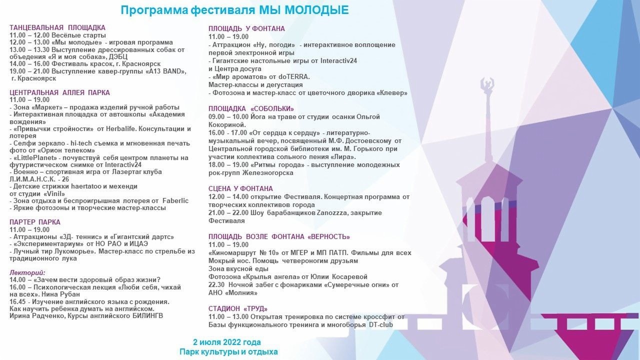 В Парке культуры и отдыха 2 июля с 11:00 до 22:00 пройдет фестиваль «Мы молодые», посвященный Дню молодежи.