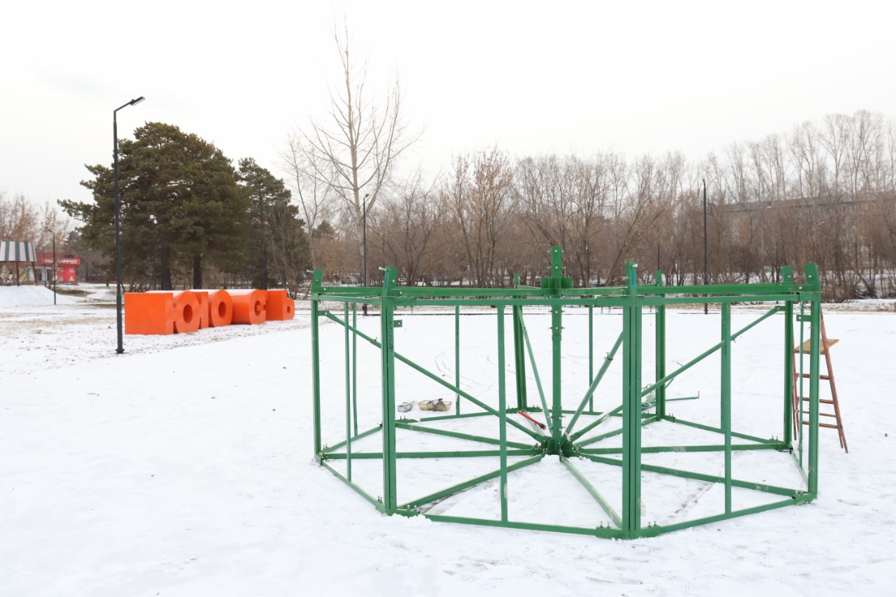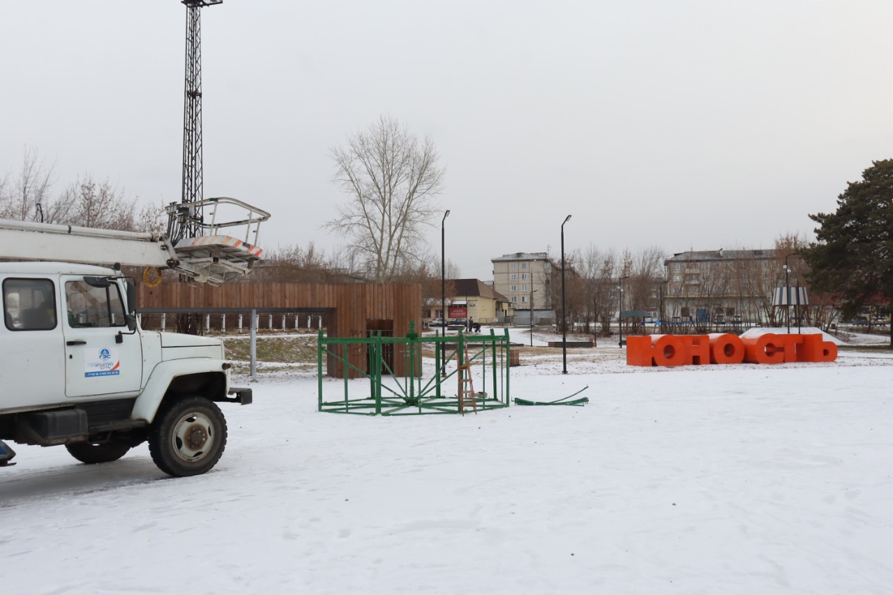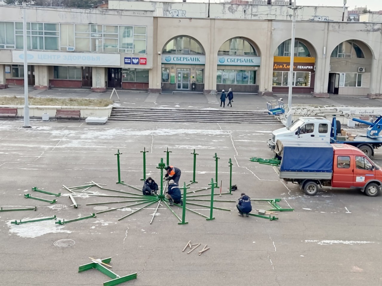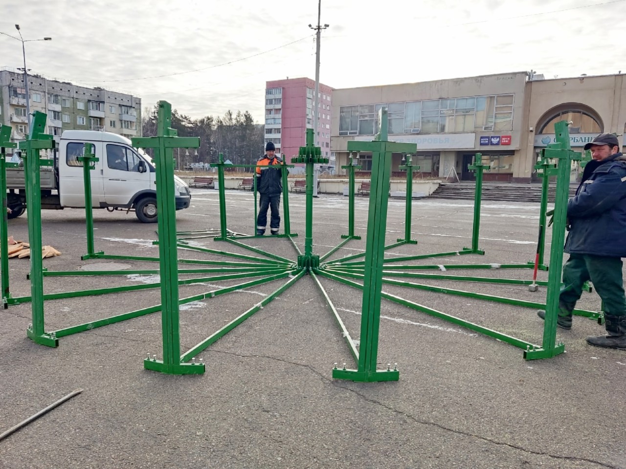Первую елку начали собирать еще 9 ноября на площади перед Центром Досуга. А сегодня основание для новогоднего дерева установили на площадке перед ДК «Юность».