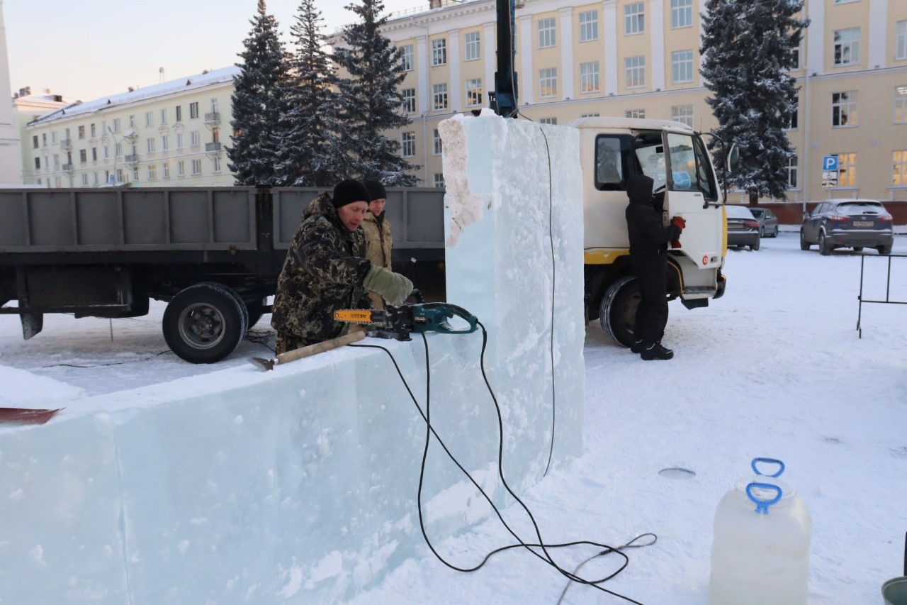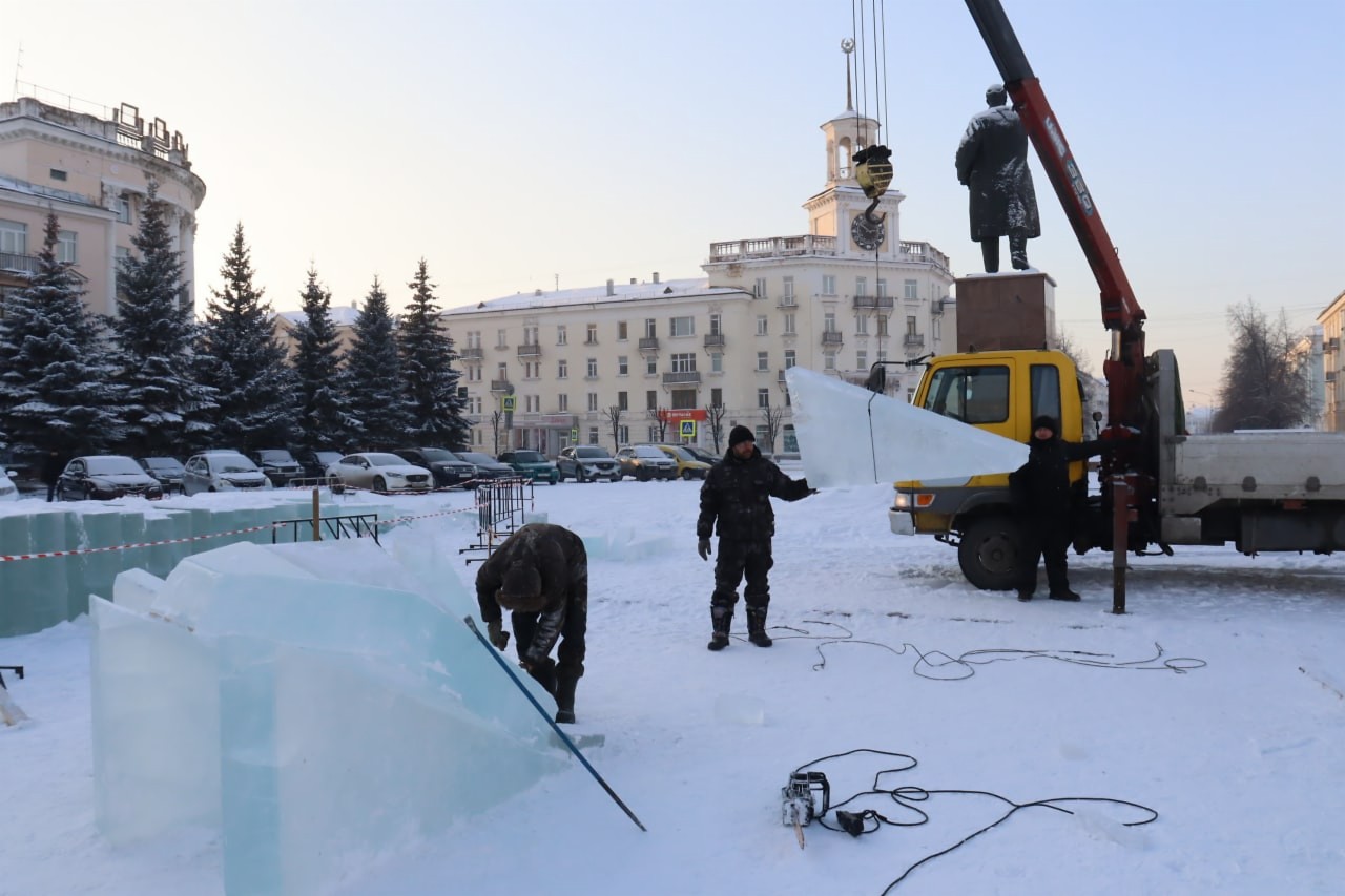 На главную площадь города привезли ледяные блоки. Скоро здесь появится Дед Мороз со Снегурочкой и замок с лабиринтом. Затем резчики по льду приступят к созданию городков на площадках перед ЦД и ДК «Юность» и в поселках ЗАТО. Этой зимой объединяющей темой праздничных ледяных строек станут сказки.