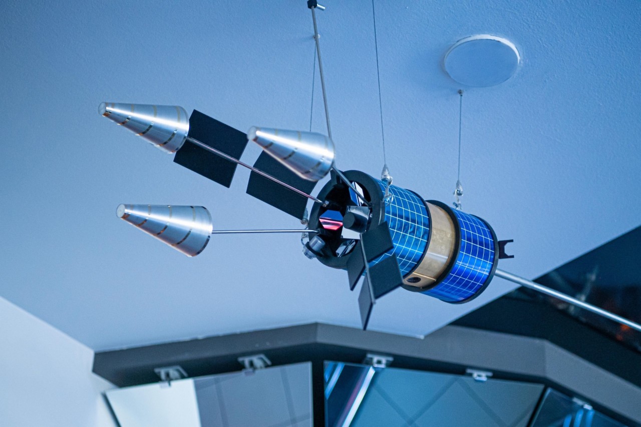 Макеты решетневских космических аппаратов украсили холл железногорского кинотеатра «Космос». На первом этаже здания выставлены образцы спутника навигации «Глонасс-К» и спутника персональной связи «Гонец-М», выполненные в масштабе один к десяти.