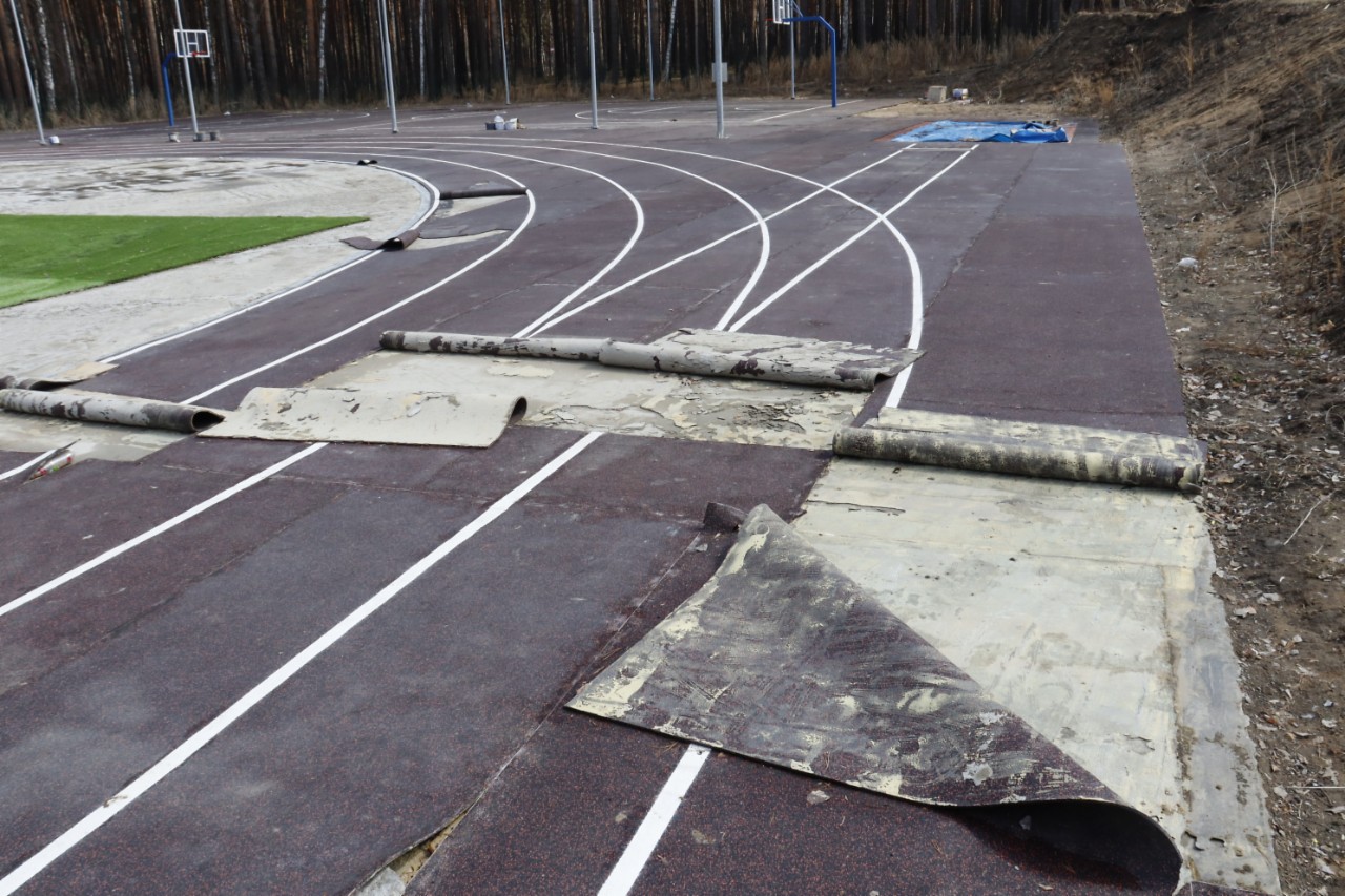 Объект сдали 14 ноября 2021 года. В следующем году подрядчик, ИП Артем Новичихин, работал на ФОКОТ по гарантии. Но что-то пошло не так. На беговой дорожке вспученная и местами отклеившаяся резина. Причем клей кусками прилип к ней, и непонятно, можно ли его оттуда счистить. Верхний слон бетонной основы раскрошился и кое-где даже пошел трещинами. Гарантия истекает осенью этого года.