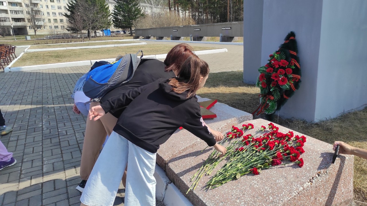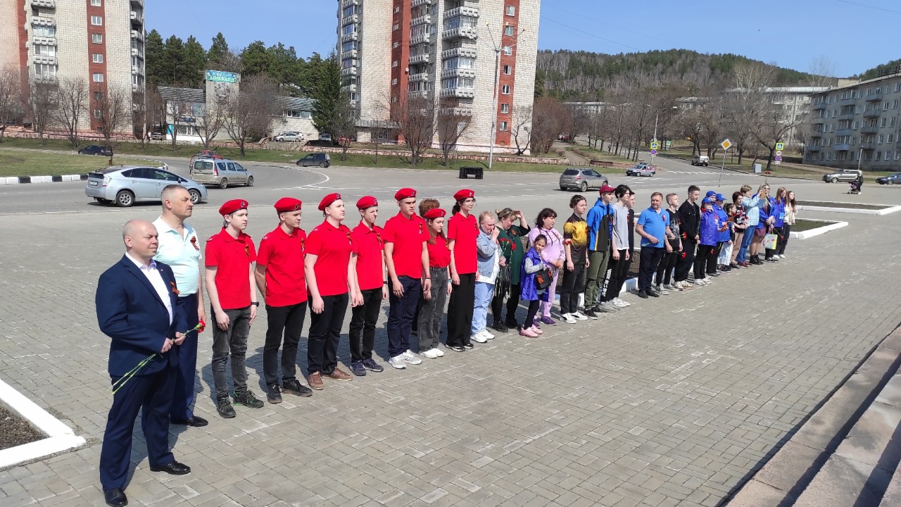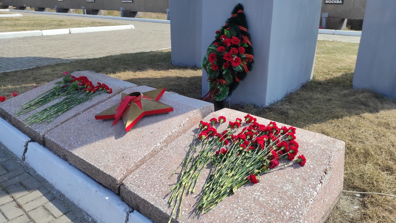 Юнармейцы в красных беретах, волонтеры Победы и жители города возложили цветы к стеле Победы.