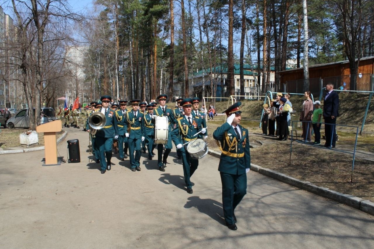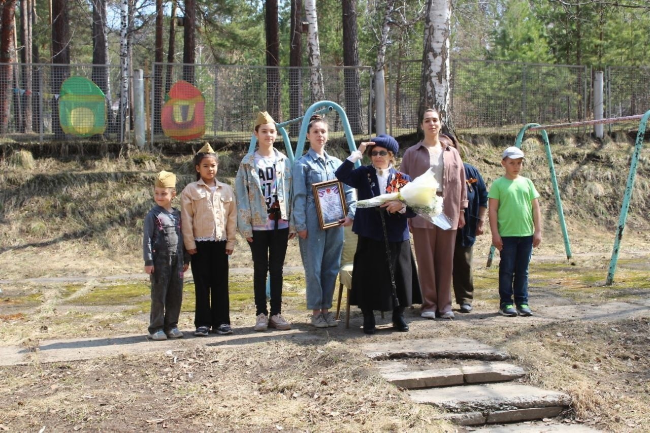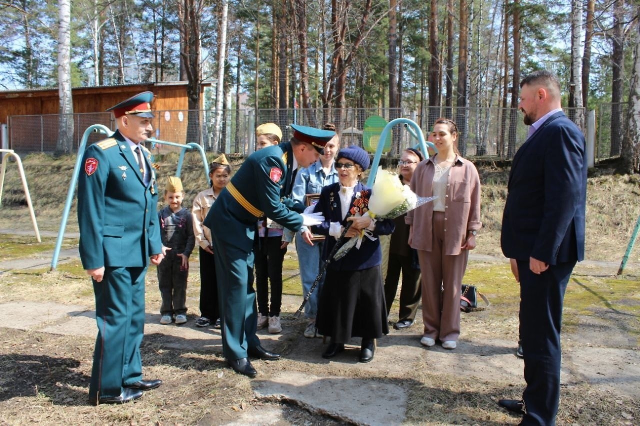 Подполковник Максим Медведев, командир войсковой части 3377, вместе с военным оркестром поздравил ветерана с Днём Победы.