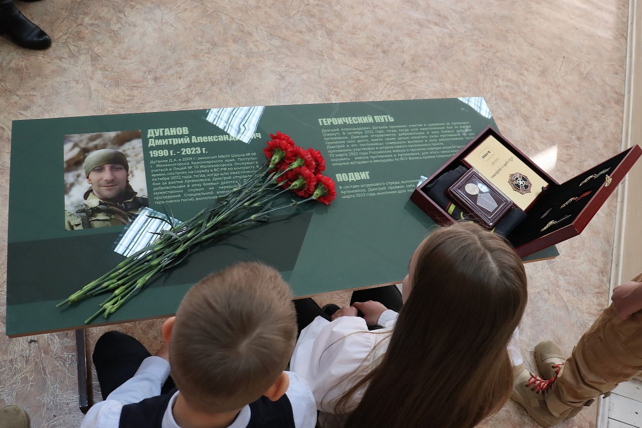 На торжественном открытии парты были родные Дмитрия, ученики и выпускники школы, а также первые лица города. Первыми за парту героя сели дочь Дмитрия Варвара и его племянник Арсений. Слез сдержать было невозможно. Но вспоминали и радостные моменты из жизни Димы, тогда еще ученика 98-й. Директор школы Игорь Рыженков рассказывает, что с поведением у Димки всегда были проблемы, и учеба тоже не давалась ему легко. Но у юноши были все качества, чтобы стать героем.