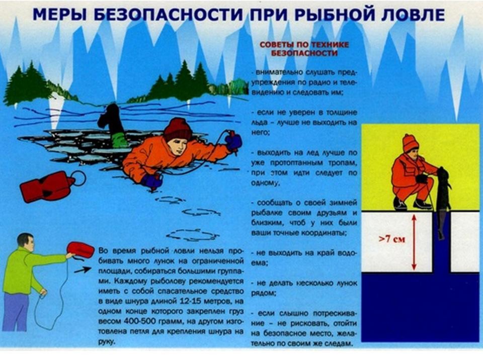 В первую очередь, на рыбалке не употребляйте алкоголь, потому что именно алкоголь в большинстве случаев является причиной всех несчастных случаев на льду. Каждому рыболову рекомендуется иметь с собой спасательное средство в виде шнура (веревки и т.п.) длиной 12 — 15 метров, на одном конце которого закреплен груз 400 — 500 граммов, на другом — заготовлена петля.