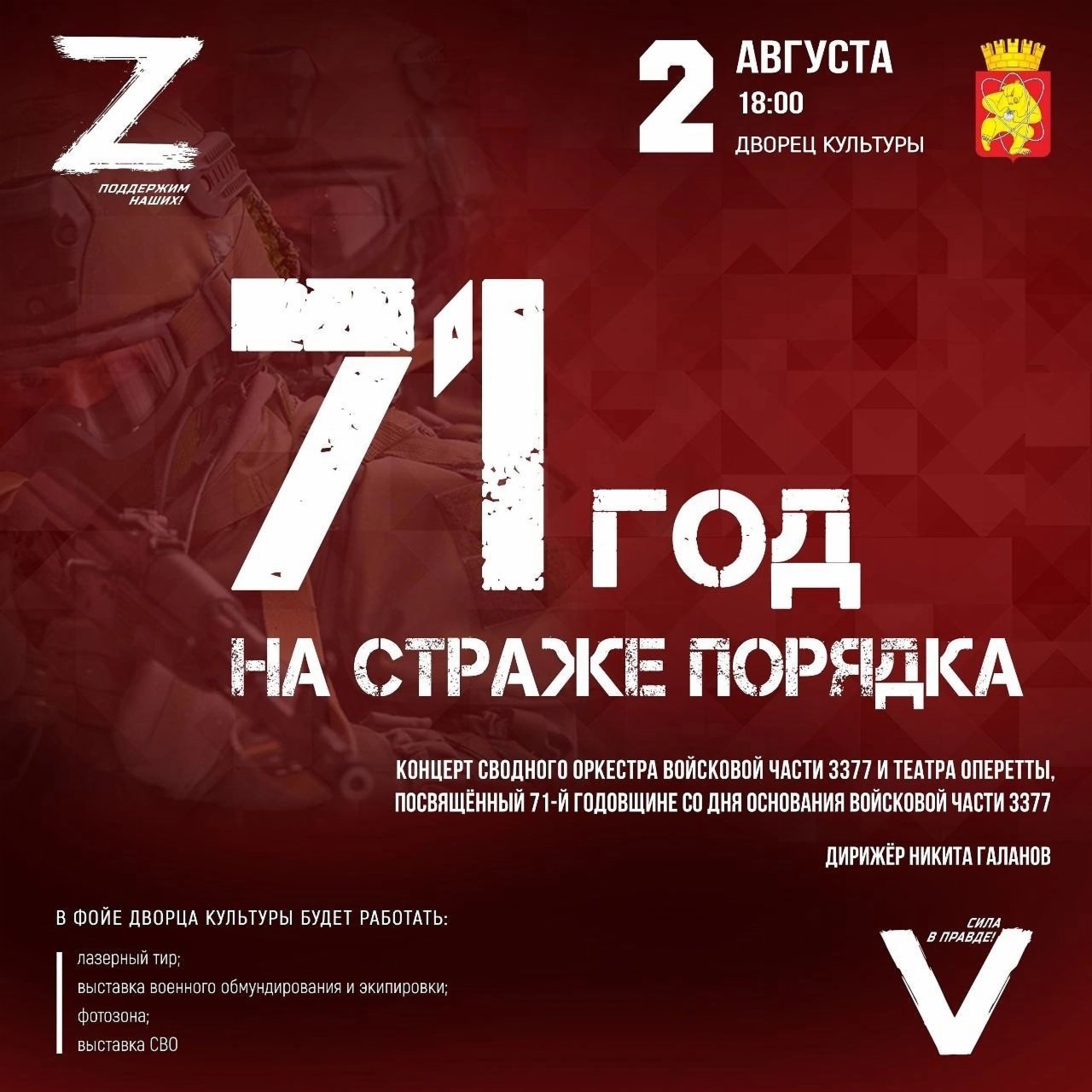 2 августа на сцене Городского Дворца культуры состоится концерт сводного оркестра войсковой части и Театра оперетты «71 год на страже порядка».