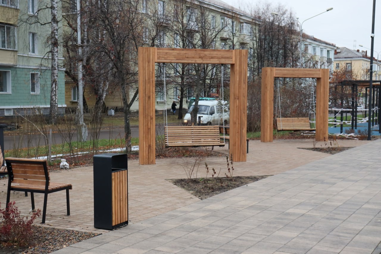 Выполнено асфальтирование, уложена брусчатка, установлено световое оборудование и видеонаблюдение, высажены деревья и кустарники, а также установлены скамейки, качели, урны, вазоны и навесы.