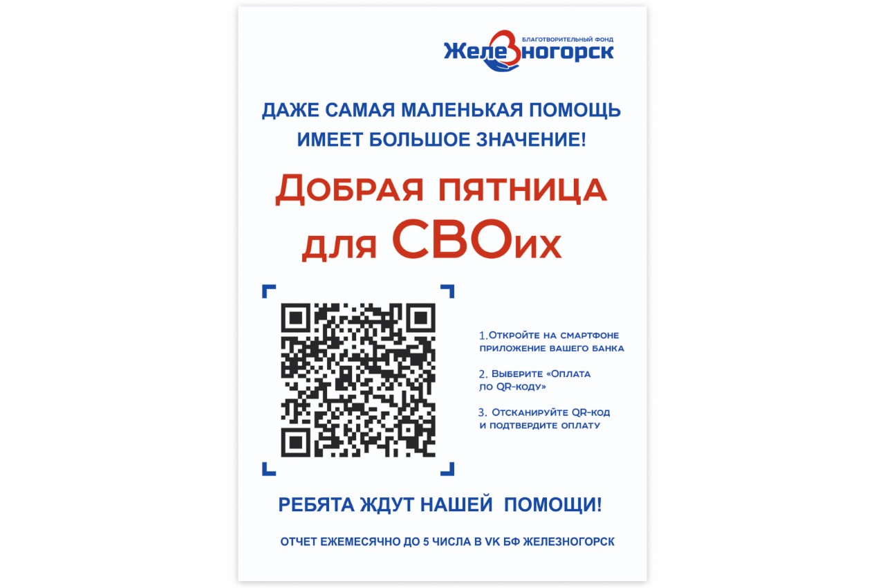 По QR –коду, можно перевести любую сумму, которая автоматически попадает на счет Благотворительного фонда «Железногорск».