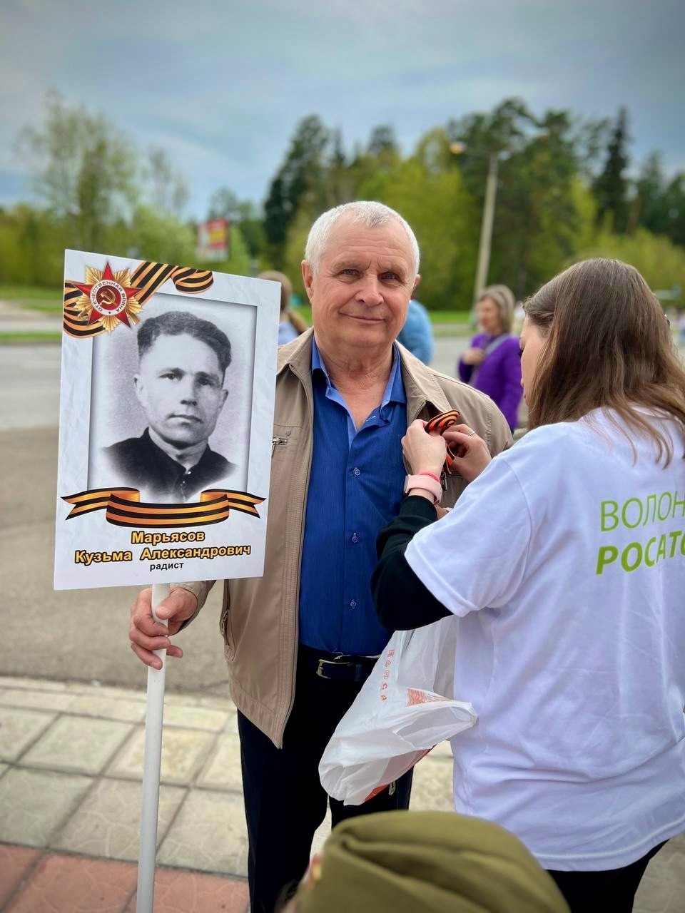 Во-первых, здесь традиционно организовали акцию «Георгиевская ленточка», вручая ленты всем желающим горожанам. А ещё - памятные флажки 80-летия Великой Победы от ЦКС.