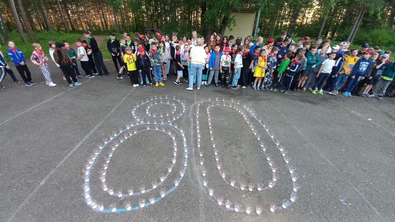 В этот вечер участники смены собрались на площадке лагеря, чтобы почтить память павших в Великой Отечественной войне. Главным символом мероприятия стала так называемая «Огненная картина»: десятки свечей были выстроены в особую композицию, а каждый желающий мог зажечь свою свечу, добавив в пламя частичку личной благодарности и уважения к подвигу наших предков.