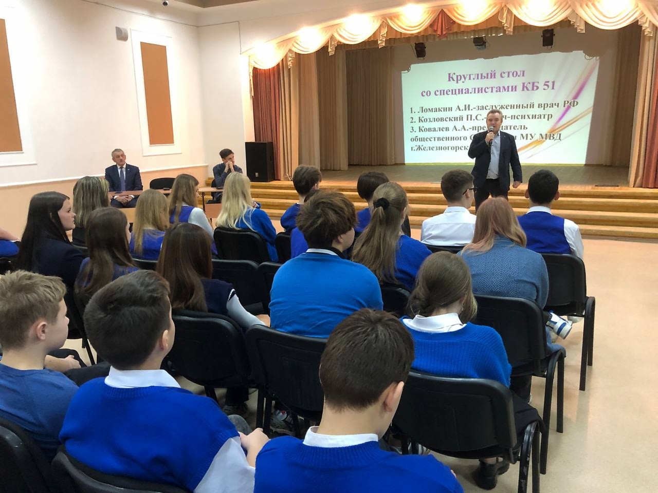На мероприятии присутствовали: Ломакин Александр Иванович заслуженный врач Российской Федерации, Козловский Петр Сергеевичврач-психиатр, Алексей Ковалев председатель Общественного совета при МУ МВД России по ЗАТО г. Железногорск.
