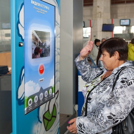 Терминал сервиса «Видеовесточка» представляет собой интерактивную панель с большим и хорошо читаемым экраном, расположен в зале ожидания вокзала. Такая техника дает возможность отправлять до сотни видеописем в день, в том числе с использованием интерактивной видеографики. Видеотекст также рассчитан на пассажиров, имеющих физические ограничения по слуху.