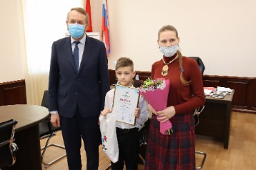 Глава ЗАТО Игорь Куксин наградил победителя конкурса "Слава Созидателям!". Им стал пятиклассник Глеб Одинокий-Утес.