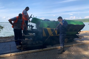 Несмотря на сильную жару (и на улице жарко, и температура асфальта достигает 140 градусов) работники КБУ справляются с поставленной задачей. Ширина дорожки — 4 метра.