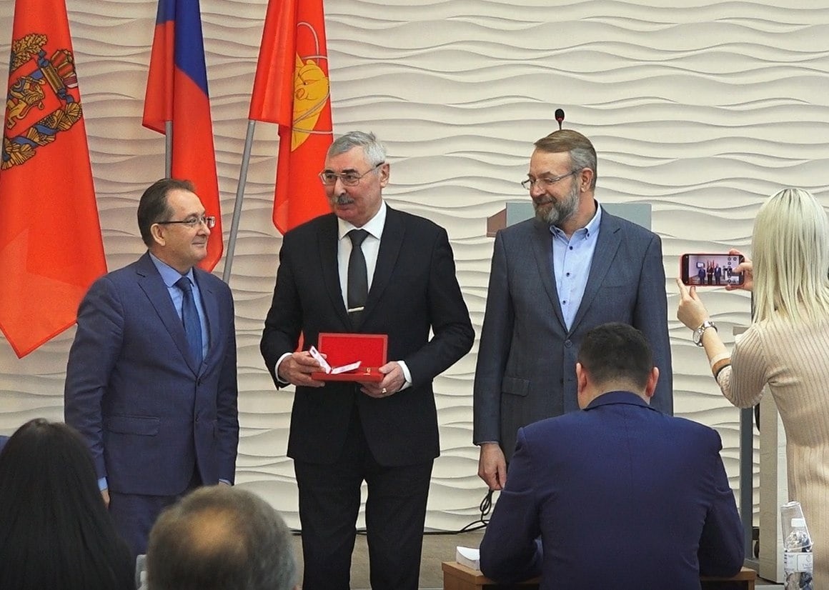 Перед началом заседания Виталию Лесняку, депутату Совета депутатов ЗАТО Железногорск, директору лицея №102, торжественно вручили награду губернатора Красноярского края – юбилейный почетный знак «200 лет образования Енисейской губернии».