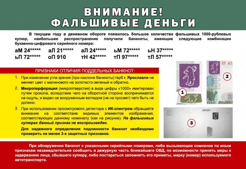 Полиция напоминает! Если у вас оказались купюры, вызывающие сомнение в подлинности, не пытайтесь их сбыть – такие действия являются основанием для привлечения к уголовной ответственности. Проверить банкноту можно в ближайшем отделении банка, если она окажется поддельной, необходимо сразу обратиться в полицию. Предлагаем ознакомиться с информацией, которая поможет отличить фальшивую купюру от настоящей.