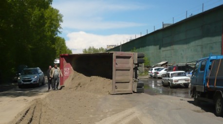 В течение полутора часов днем 6 июня движение по улице Енисейской около магазина«Светофор» было затруднено. Дорогу перегородил опрокинувшийся грузовик с песком.