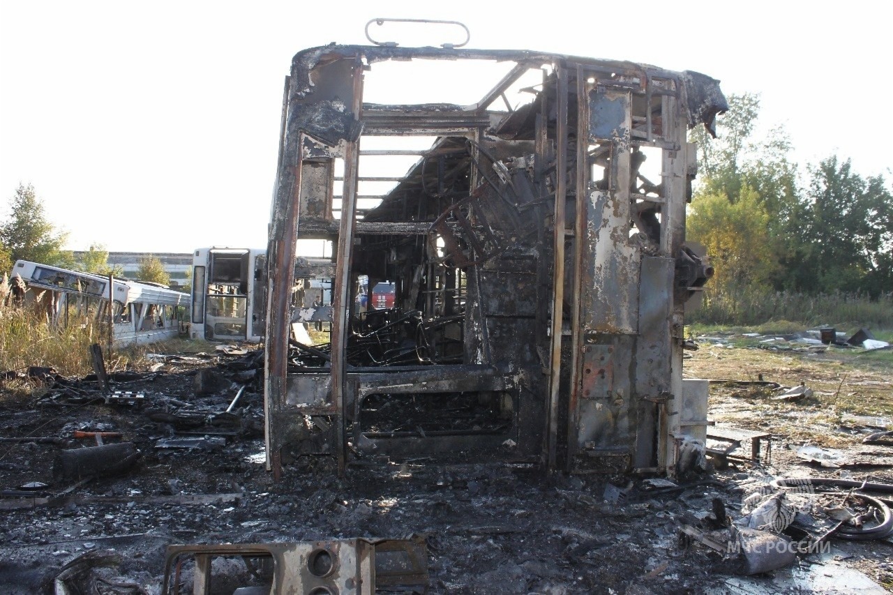 На момент прибытия автоцистерны и пожарно-спасательного автомобиля СПСЧ № 4 происходило открытое горение автобуса, существовала угроза распространения огня на рядом стоящий неэксплуатируемый автобус. Пострадавших нет.