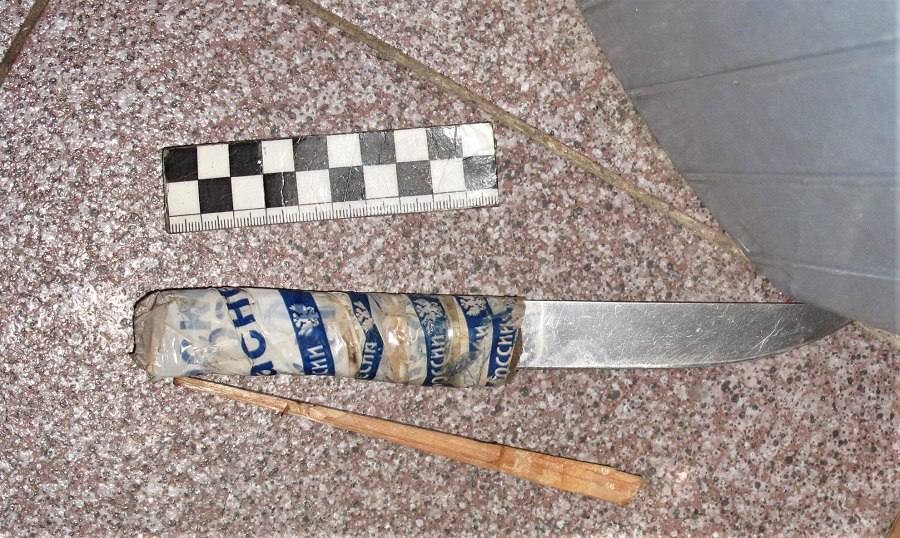 На полу сотрудниками полиции было обнаружено орудие преступления - кухонный нож, на шее заявительницы остался след в виде ссадины. Подозреваемый был задержан и передан следственно-оперативной группе.