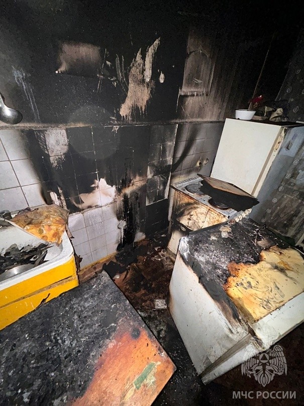 Пожар ликвидирован на площади 1 кв.м. В результате уничтожена морозильная камера, повреждена отделка кухни, закопчены стены и потолок в коридоре. Причина возгорания - аварийный режим работы электропроводки.