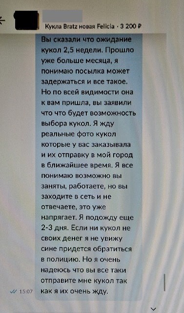 В ходе проверки сотрудники отдела уголовного розыска Максим Шальков и Андрей Качурин установили личность автора объявлений и опросили ее. Оказалось, что продавец обманывать никого не хотела, но по объективным причинам поставка игрушек сильно задержалась. Из-за жалоб покупателей администрация сайта заблокировала ее профиль, все контакты утрачены.