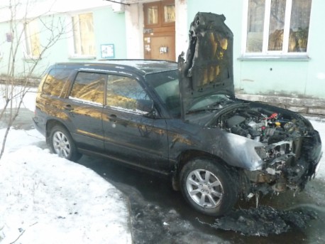 На следующий день на пульт ЕДДС поступило сообщение о горящем легковом автомобиле марки «Subaru Forester» во дворе по ул. Свердлова, 34. Огнем повреждены фары, решетка радиатора, правое крыло, капот, воздушный фильтр, радиатор, бампер, изоляция электропроводов в моторном отсеке. Предположительная причина случившегося - аварийный режим работы противотуманной фары автомобиля.