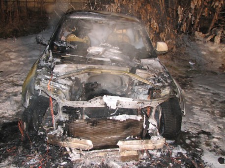 Огнем полностью уничтожено подкапотное пространство, передний бампер, передние фары, переднее правое колесо, крышка капота, повреждено лакокрасочное покрытие всего автомобиля, обшивка салона, левое переднее и два задних колеса. Пострадали припаркованные рядом автомобили: у автомобиля Toyota Vitz повреждены два дефлектора с левой стороны и передний бампер, у автомобиля ВАЗ 2111 повреждена передняя фара, повторитель поворота, зеркало бокового вида с правой стороны. Площадь возгорания составила 3 кв.м.
