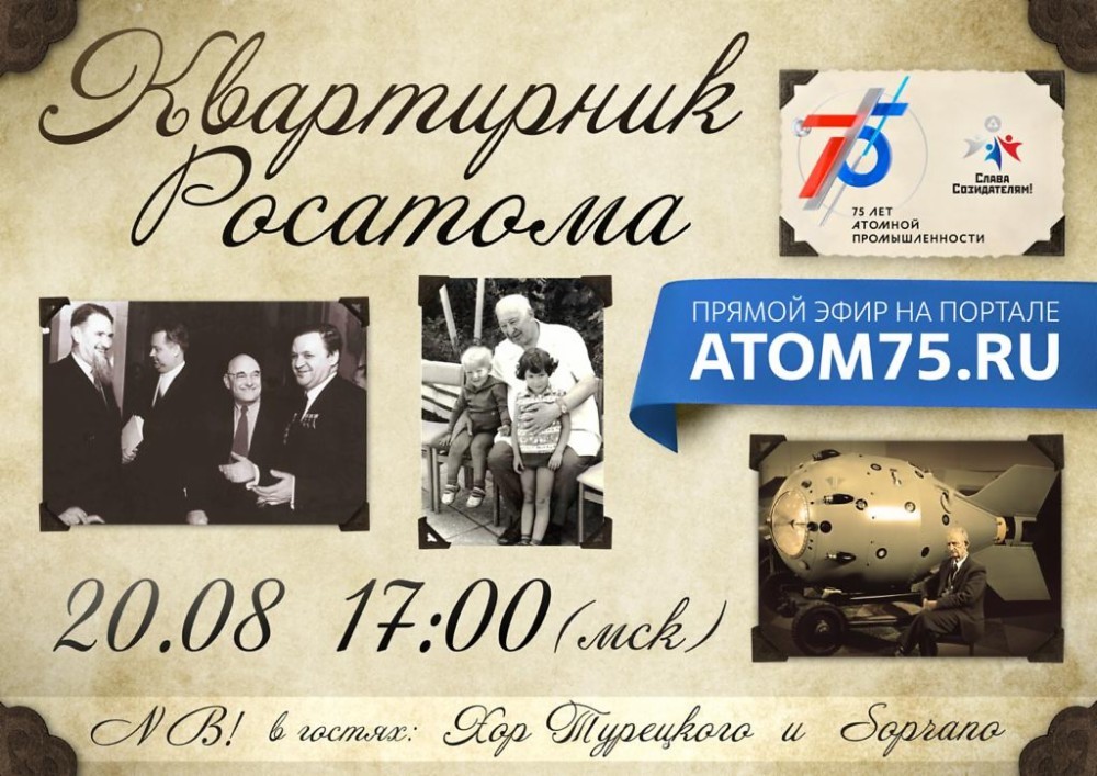В день рождения атомной промышленности Росатом организует онлайн-квартирник для работников отрасли 20 августа в 17.00 (по московскому времени) – в день рождения отечественного атомпрома – на онлайн-площадке atom75.ru состоится большой “Квартирник Росатома” для всех работников атомной промышленности, ветеранов отрасли, их семей, жителей атомных городов и ЗАТО. В прямом эфире будут выступать «Хор Турецкого» и арт-группа Soprano.В 2020 году отмечается 75-летие атомной промышленности. Программа юбилейных мероприятий рассчитана на 75 дней, начиная с 20 августа. За это время пройдут более сотни онлайн- и офлайн-мероприятий разного масштаба, включая концерты, фотовыставки, запуск диджитал-проектов, образовательные и просветительские мероприятия, участником которых может стать каждый житель РФ.
