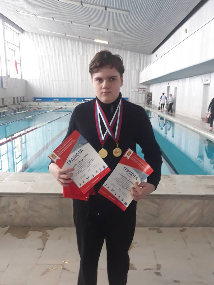 Дима занимается плаванием у тренера Сергея Парыгина больше 6 лет, постоянно выступает на соревнованиях. За это время он получил больше 18 медалей и больше 40 грамот, имеет третий взрослый разряд.